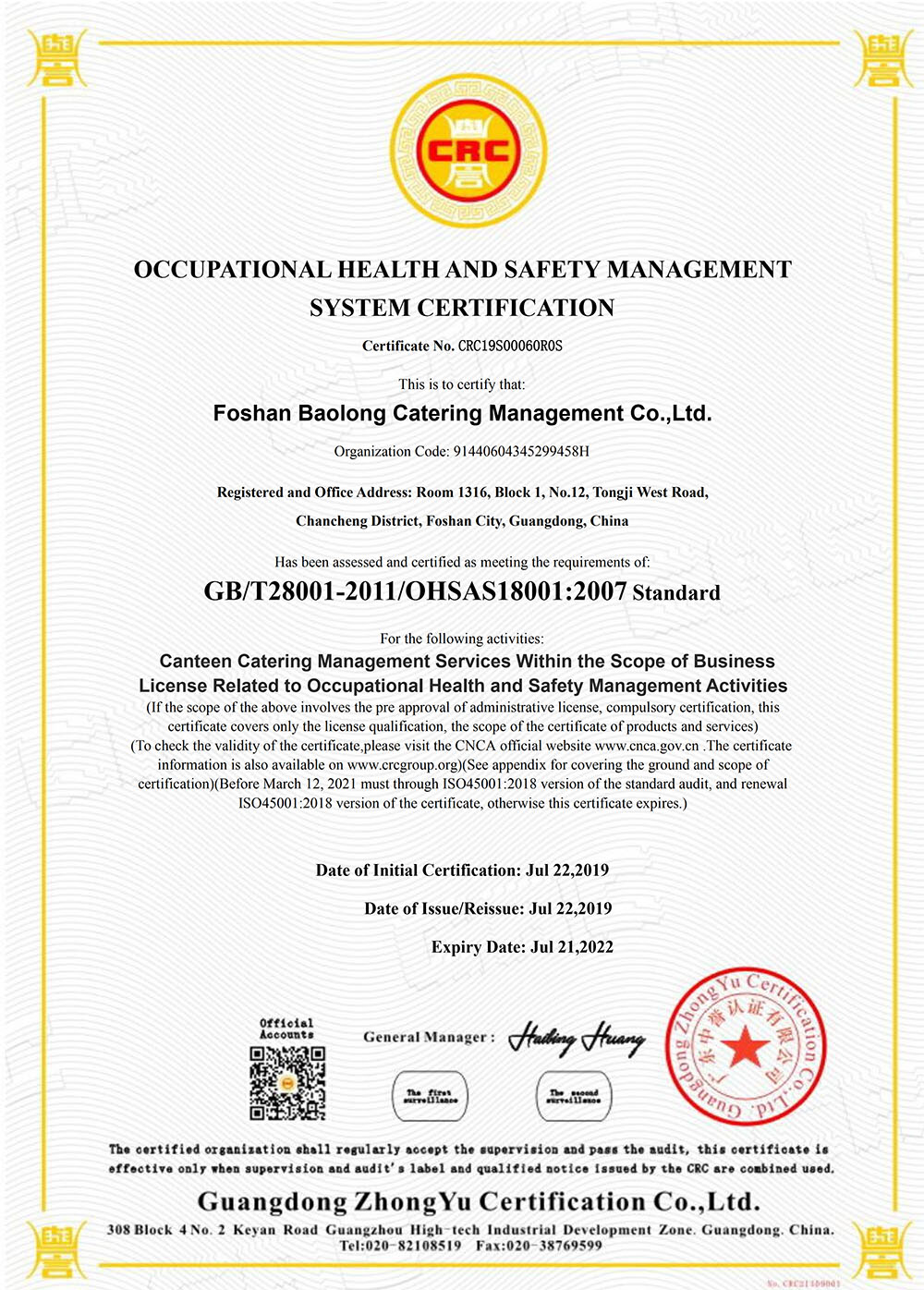 榮譽(yù)資質(zhì) 您的位置:網(wǎng)站首頁(yè) > 關(guān)于寶隆 > 榮譽(yù)資質(zhì) 職業(yè)健康管理體系英 寶隆餐飲 更新時(shí)間:2020-07-16 佛山寶隆餐飲管理有限公司 閱讀 上一條職業(yè)健康管理體系中 下一條沒(méi)有了