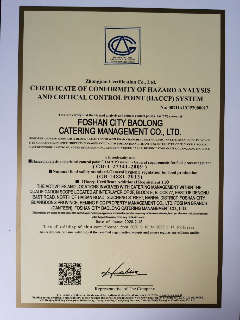 榮譽(yù)資質(zhì) 您的位置:網(wǎng)站首頁(yè) > 關(guān)于寶隆 > 榮譽(yù)資質(zhì) 危害分析與關(guān)鍵控制點(diǎn)體系認(rèn)證英 寶隆餐飲 更新時(shí)間:2020-07-16 佛山寶隆餐飲管理有限公司 閱讀 上一條危害分析與關(guān)鍵控制點(diǎn)體系認(rèn)證中 下一條質(zhì)量管理體系認(rèn)證英