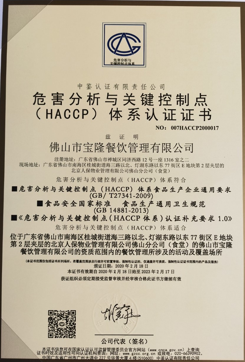 榮譽(yù)資質(zhì) 您的位置:網(wǎng)站首頁 > 關(guān)于寶隆 > 榮譽(yù)資質(zhì) 危害分析與關(guān)鍵控制點(diǎn)體系認(rèn)證中 寶隆餐飲 更新時間:2020-07-16 佛山寶隆餐飲管理有限公司 閱讀 上一條食品安全管理體系認(rèn)證英 下一條危害分析與關(guān)鍵控制點(diǎn)體系認(rèn)證英