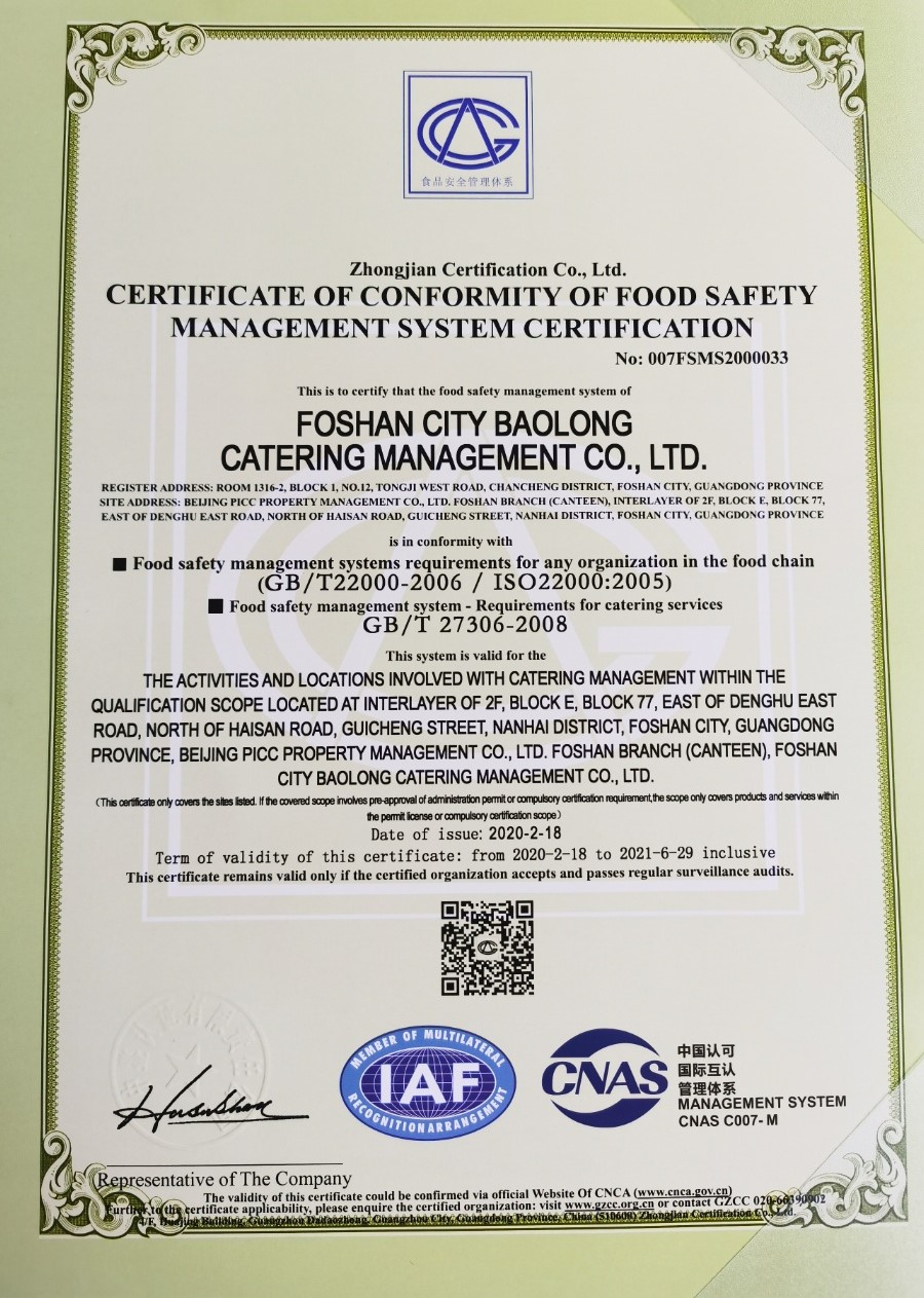 榮譽(yù)資質(zhì) 您的位置:網(wǎng)站首頁 > 關(guān)于寶隆 > 榮譽(yù)資質(zhì) 食品安全管理體系認(rèn)證英 寶隆餐飲 更新時(shí)間:2020-07-16 佛山寶隆餐飲管理有限公司 閱讀 上一條食品安全管理體系認(rèn)證中 下一條危害分析與關(guān)鍵控制點(diǎn)體系認(rèn)證中